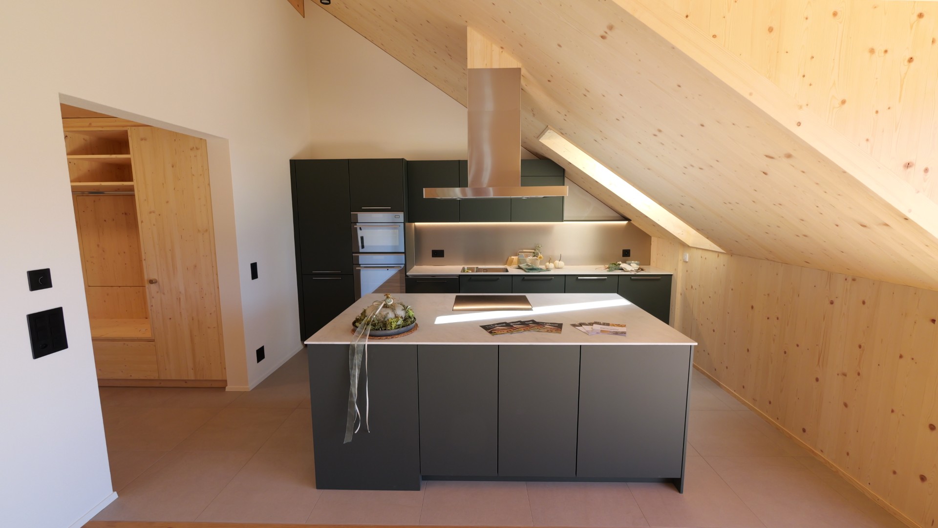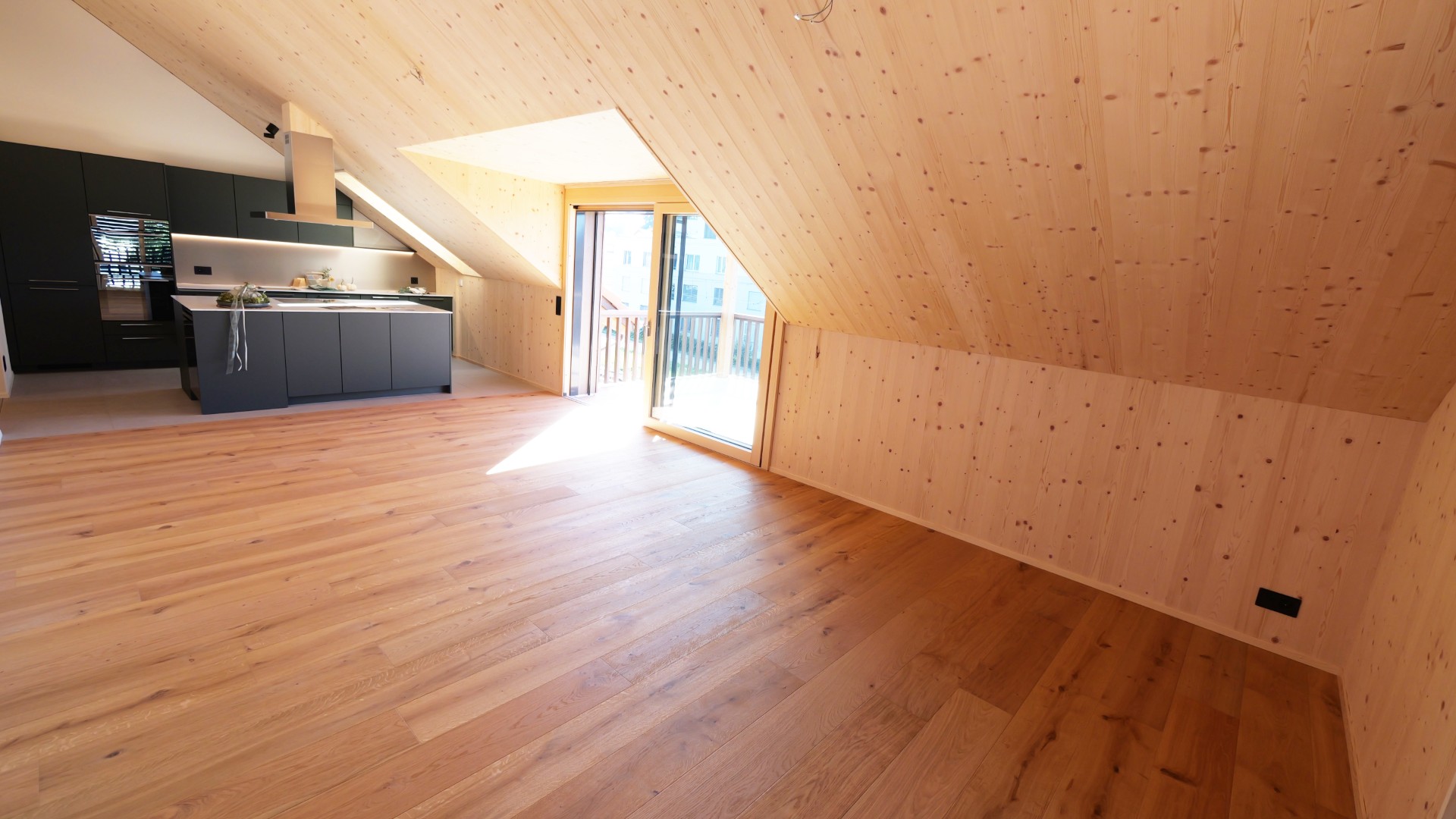 Diese charmante Dachwohnung überzeugt mit einem durchdachten Grundriss, viel Tageslicht und einem offenen Wohnkonzept. Der grosszügige Wohn- und Essbereich mit moderner Küche und Kochinsel bildet das Herzstück der Wohnung.